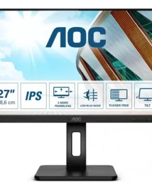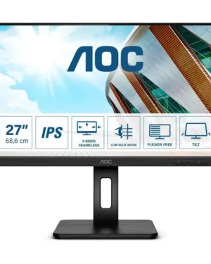 Le moniteur AOC 27″ *27P2Q* est un écran IPS de 75 Hz avec un temps de réponse de 4 ms. Il dispose d’un pied réglable et est compatible avec les connectiques D-SUB, DVI, HDMI, HP, USB et DP.