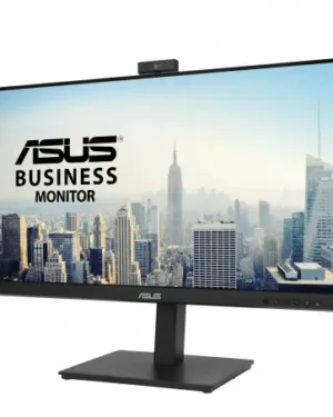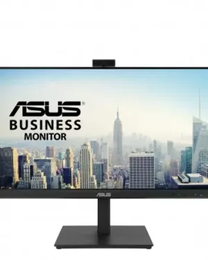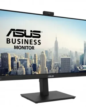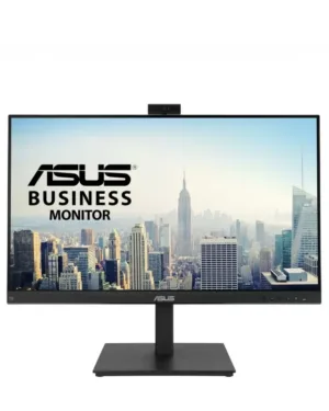 Moniteur ASUS 27″ BE279QSK avec webcam intégrée, technologie IPS, résolution FHD, temps de réponse de 5 ms et fréquence de rafraîchissement de 60 Hz. Connectivité VGA/HDMI/DP/USB et haut-parleurs intégrés. Support inclus.
