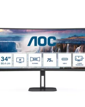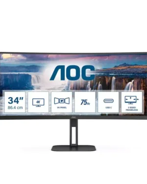 Le moniteur AOC 34″ *CU34V5C/BK* est un écran VA de 1ms avec un taux de rafraîchissement de 100Hz. Il est équipé de ports HP, HDMI, DP, USB et USB-C.