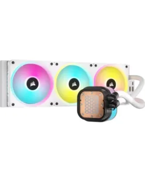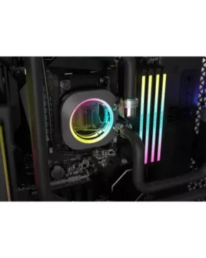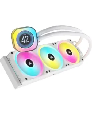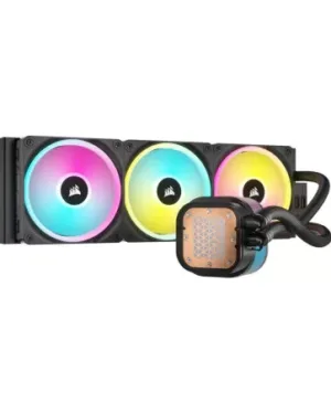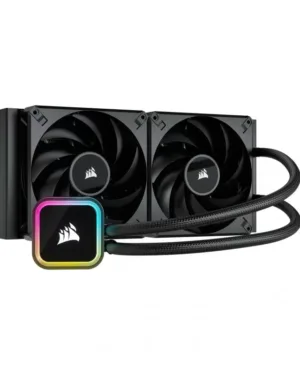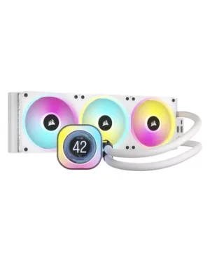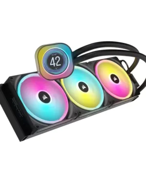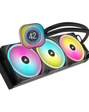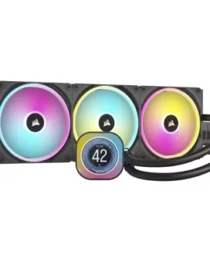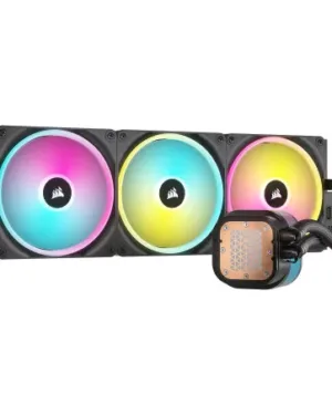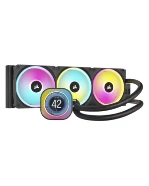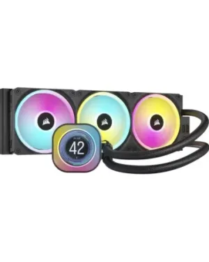 Le CORSAIR iCUE LINK H150i est un système de refroidissement à eau tout-en-un avec un radiateur de 360mm, des ventilateurs QX120 RGB et un écran LCD pour afficher les informations sur le système.