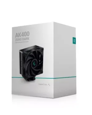 Ventilateur pour processeur DEEPCOOL AK400 ZERO DARK avec dissipateur thermique en aluminium et 4 caloducs en cuivre, compatible avec sockets Intel et AMD. Conception optimisée pour un refroidissement efficace et silencieux.